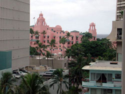 ラナイからの眺めは、ロイヤルハワイアンの後ろにちらり海が見えています。ワイキキを散策する人々の姿など、ラナイでのひとときも楽しめるでしょう。