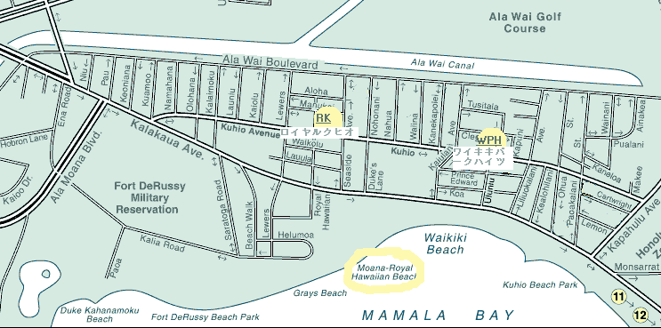 ロイヤルクヒオ・ワイキキパークハイツ 滞在先が決定したら、道順は詳しくお知らせします。ご不明の場合はお問合せください。 上の地図には、ロイヤルクヒオとワイキキパークハイツの位置が示してあります。メインストリートのカラカウラア・べニューからもすぐ近くです。どちらの建物も、ワイキキの中心部クヒオ通りです。 ワイキキビーチは現在補修工事が終わり生まれ変わりました。どこもきれいに整備され、イベントも盛りだくさんです! ところで、ハワイのビーチはすべてがパブリックです。ご存知でしたか?